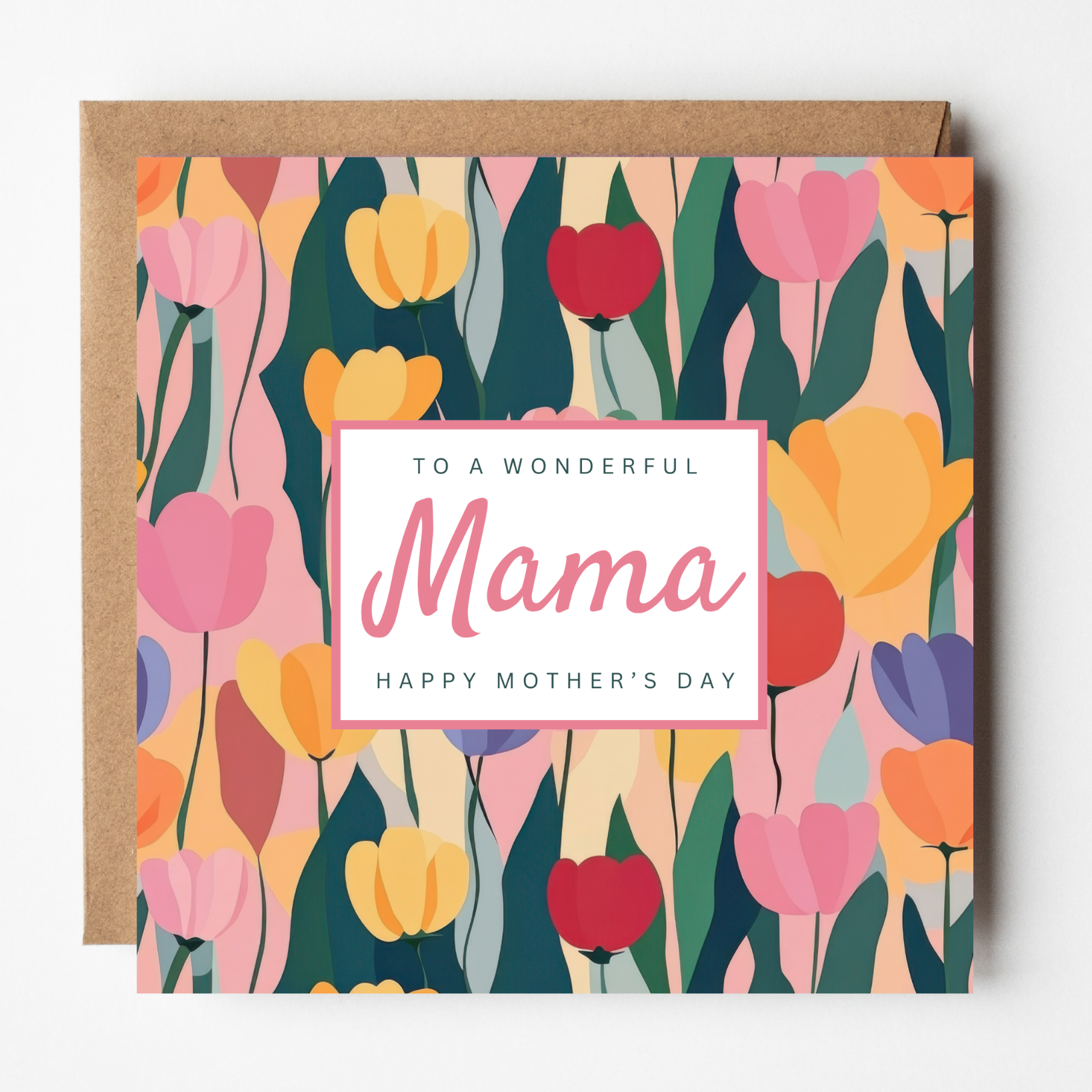 A Mother's Day card for Mama. Bright contemporary tulip design to brighten her special day.